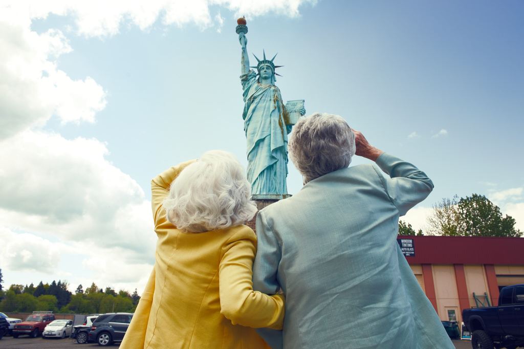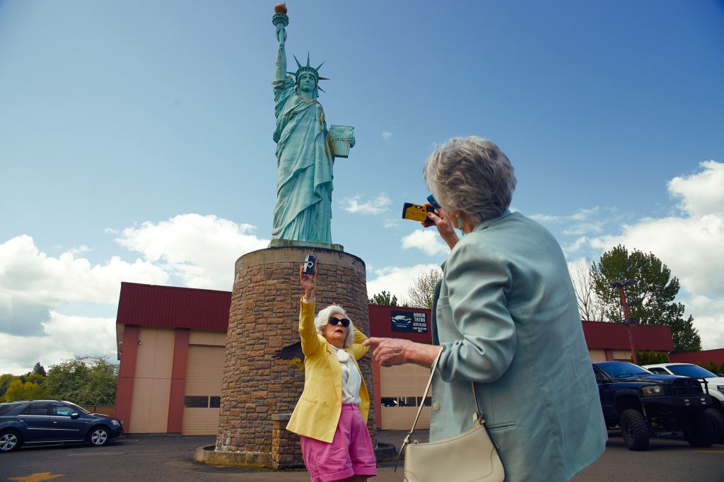 Next, they braved the labyrinth of public transit, navigating with their trusty paper map and a mutual mistrust of “those talking phone gadgets.” Four missed buses later (but still in good spirits—it was an adventure, after all), they arrived to pay homage to Iowa’s proudest attraction: a 1/10th-scale Statue of Liberty standing tall—or at least upright—in the back lot of Freedom RV & Marine, rows of gleaming RVs stretched out behind her like manifest destiny on wheels.